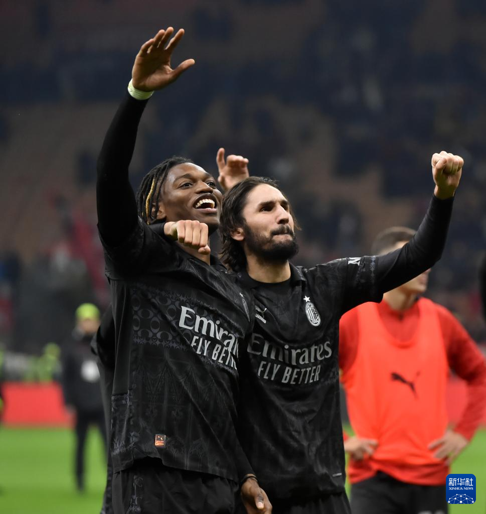 2月11日,AC米兰队球员莱奥(左)和阿德利在赛后庆祝胜利。新华社发(阿尔贝托·林格利亚摄)