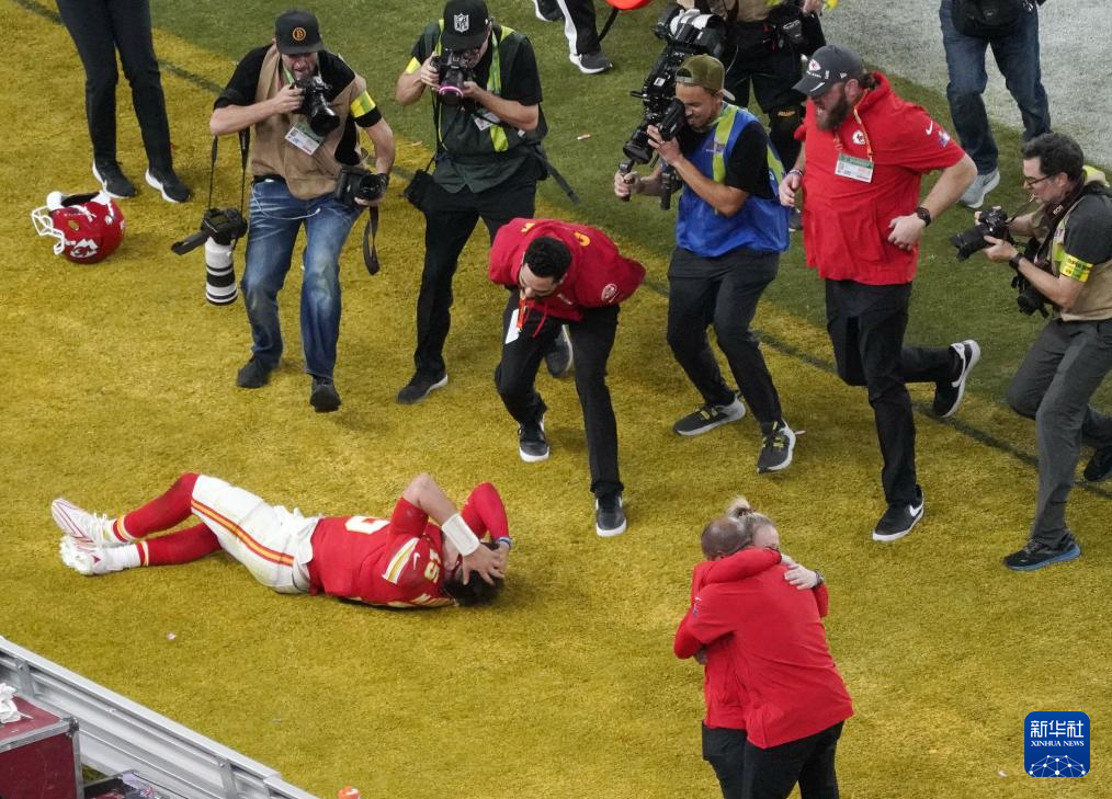2月11日,堪萨斯城酋长队球员帕特里克·马霍姆斯倒地庆祝胜利。新华社记者 吴晓凌 摄