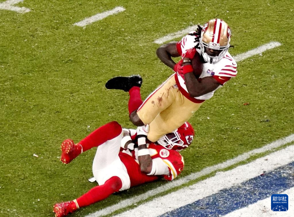 2月11日,旧金山49人队员瑞安(右)防守堪萨斯城酋长队球员拉希·赖斯。新华社记者 吴晓凌 摄