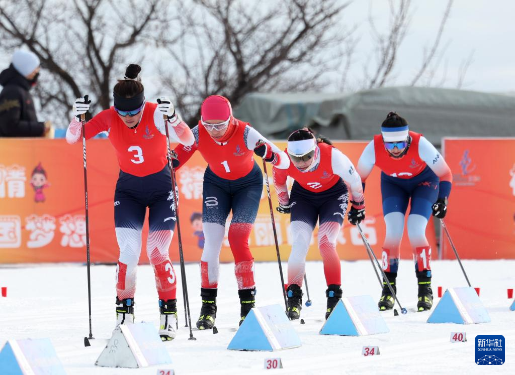 2月14日,黑龙江选手池春雪(右二)、新疆选手迪妮格尔·衣拉木江(右一)、黑龙江选手李馨(左二)、黑龙江选手陈玲双在比赛中。最终她们分别获得冠、亚、季军和第四名。