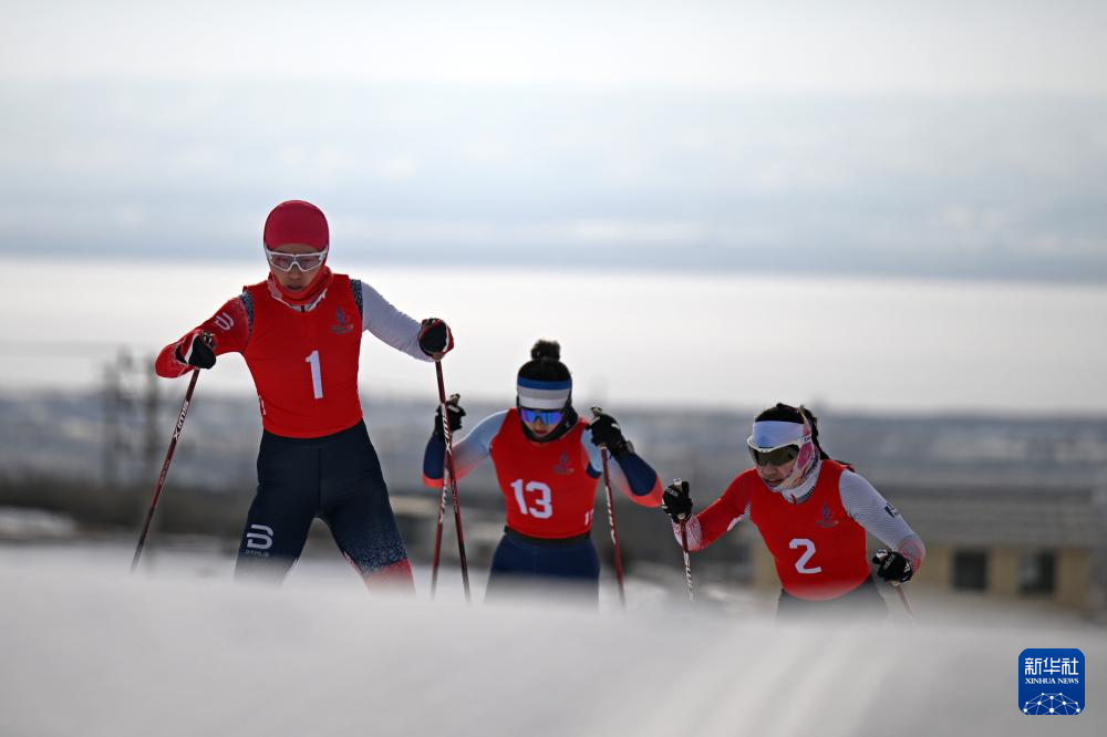 2月14日,黑龙江选手池春雪(右)、新疆选手迪妮格尔·衣拉木江(中)、黑龙江选手李馨在比赛中。最终她们分别获得冠、亚、季军。