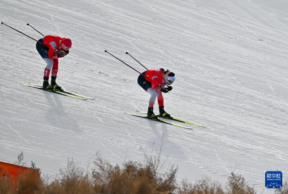 2月14日,黑龙江选手池春雪(右)在比赛中,她以41分26秒0的成绩夺得冠军。