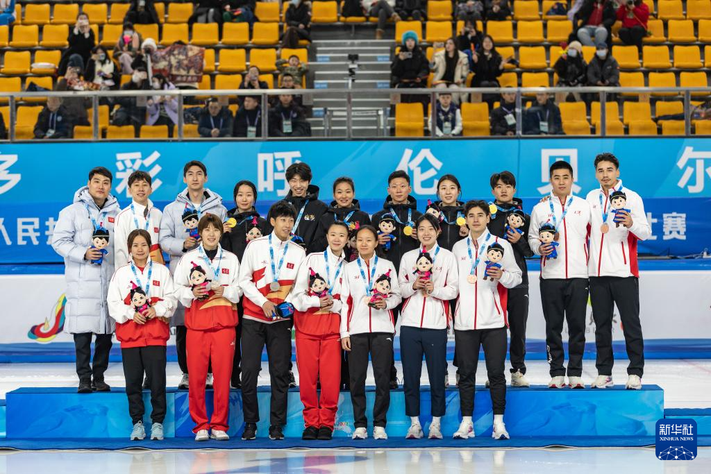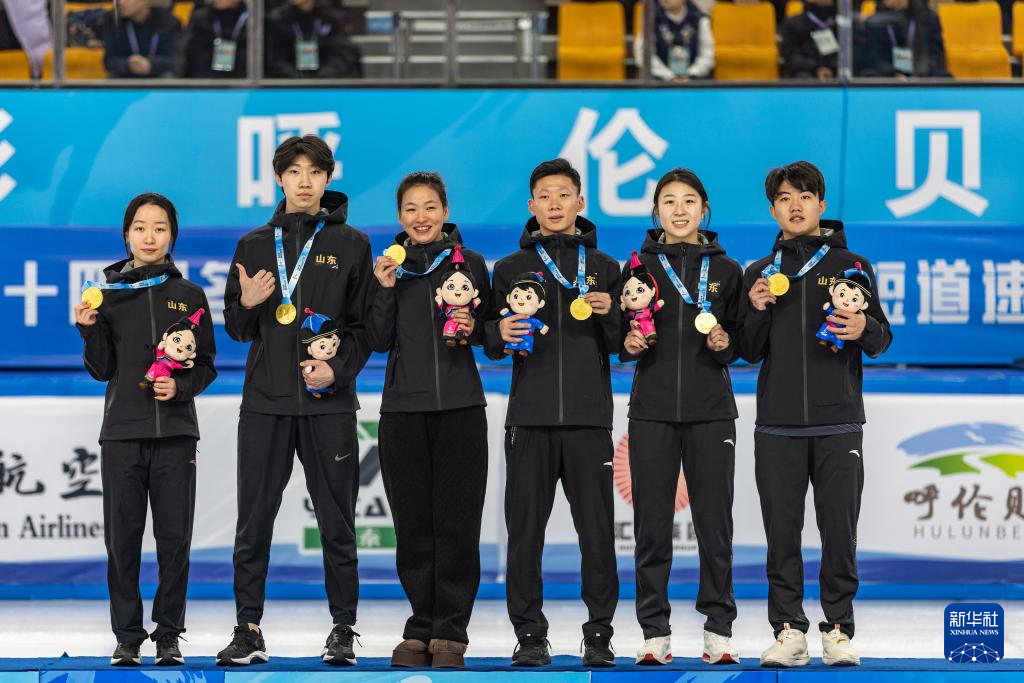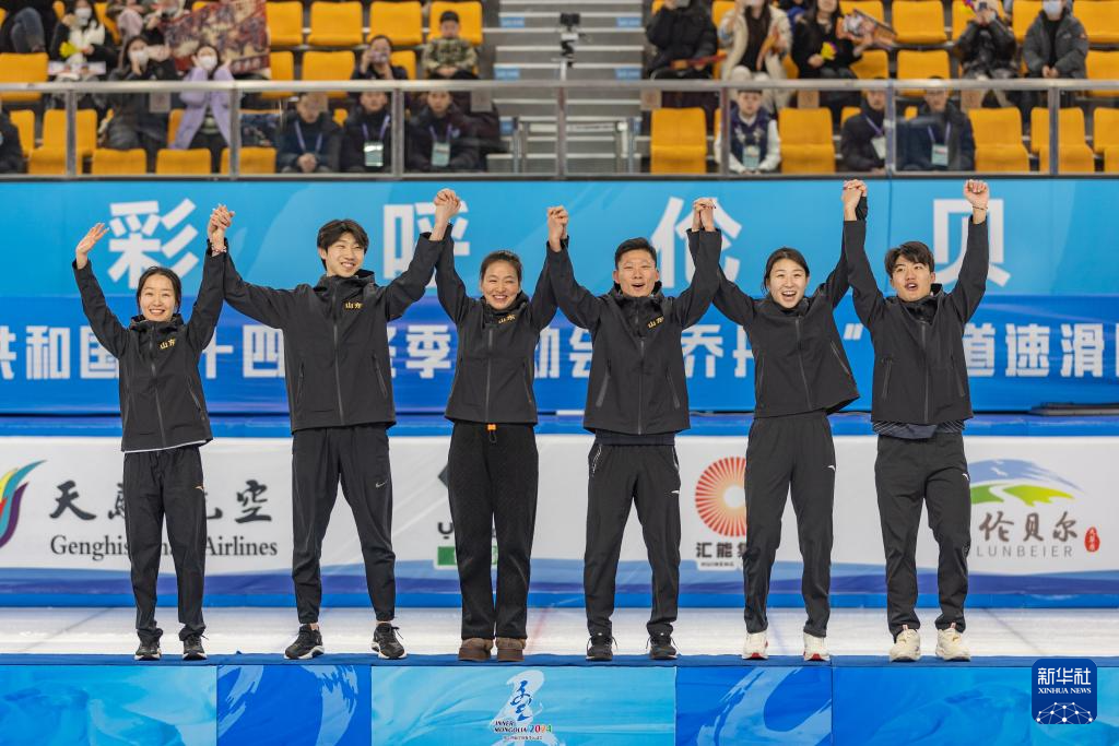 当日,第十四届全国冬季运动会短道速滑(公开组)混合团体接力决赛在内蒙古呼伦贝尔市海拉尔区内蒙古冰上运动训练中心短道速滑馆举行。山东队以2分42秒906的成绩获得冠军,吉林队和天津队分别以2分43秒312和2分49秒873的成绩获得亚军和季军。