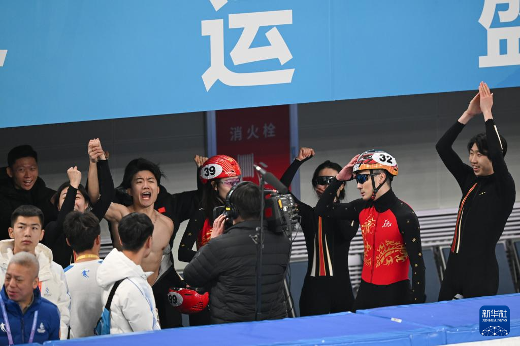 2月16日,山东队选手李文龙(上,左三)在公布最终成绩后与队友庆祝。原本第一个冲线的黑龙江队选手任子威(右二)神情失落。新华社记者 胥冰洁 摄