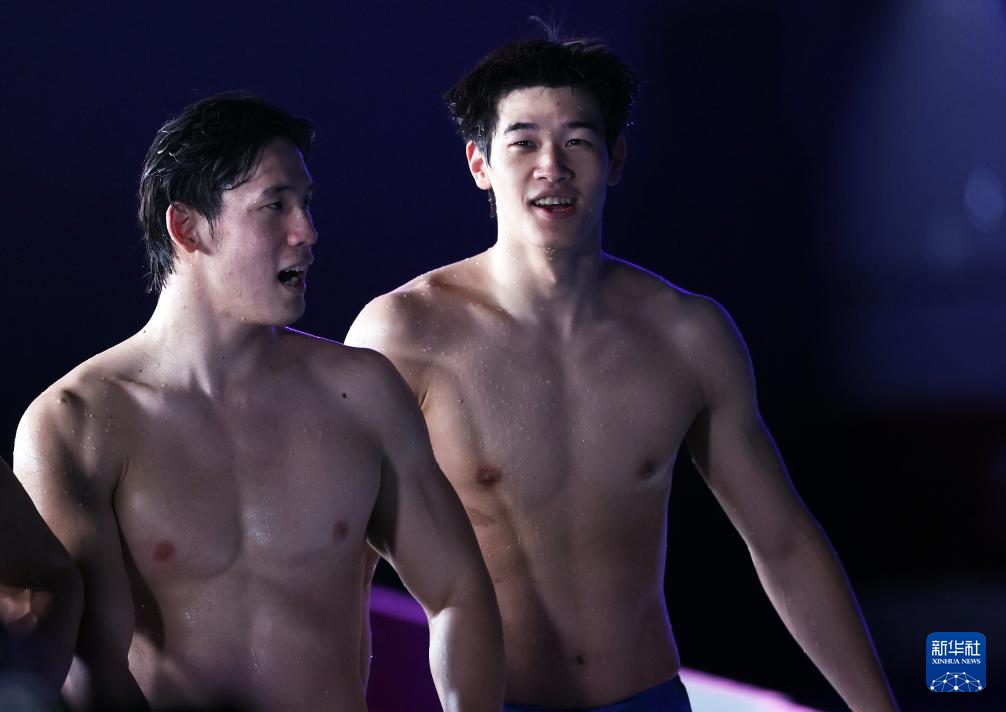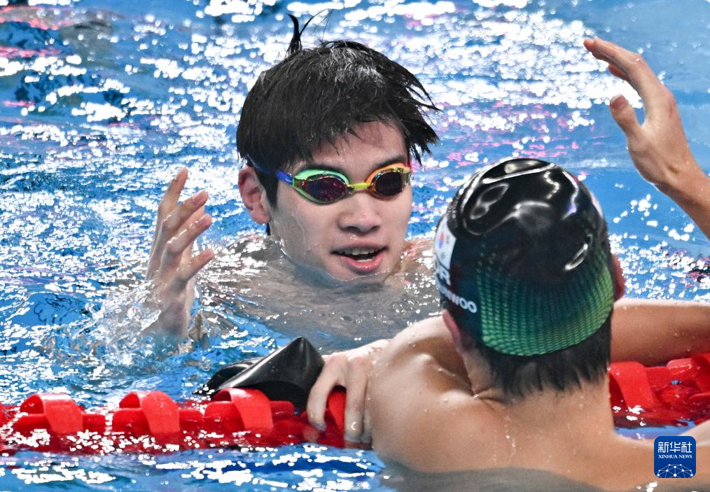 2月15日,中国选手潘展乐(左)在比赛后接受韩国选手黄宣优的祝贺。