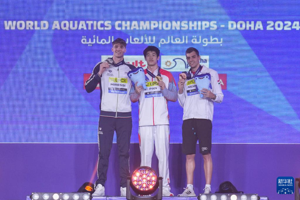 2月15日,冠军中国选手潘展乐(中)、亚军意大利选手米雷西(左)和季军匈牙利选手内梅特在颁奖仪式上。