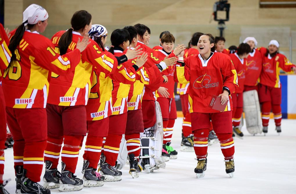2015年4月11日,中国队球员齐雪婷(右前)在获颁本场最佳球员后与队友击掌庆祝。当日,在北京举行的2015国际冰联女子冰球世锦赛甲级B组比赛中,中国队以4比3战胜意大利队。新华社记者李明摄
