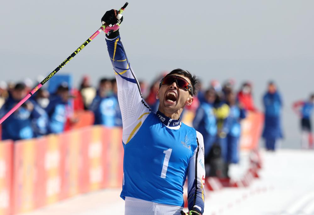 2月17日,重庆队选手王强在比赛后庆祝,他以3分10秒01的成绩获得冠军。新华社记者 张晨霖 摄