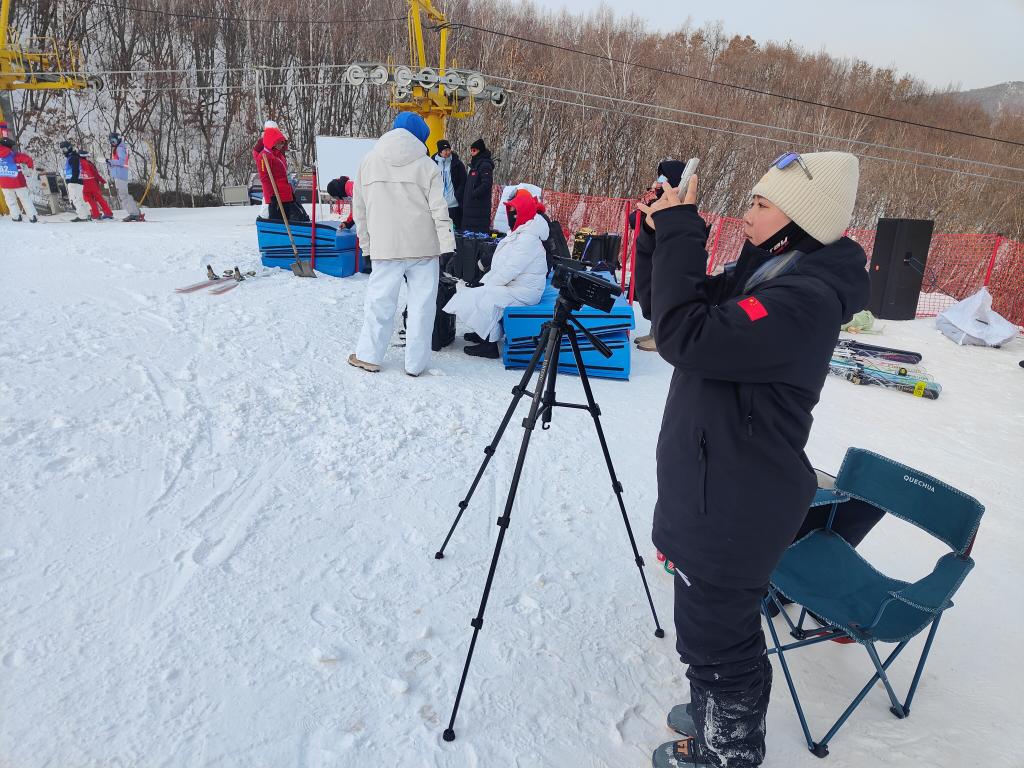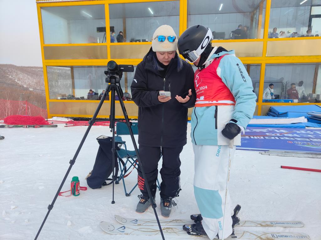 16日的雪上技巧公开训练环节,宁琴用录像机和手机分别将弟子们的滑行画面记录下来。等吉林队选手马卓妮完成一轮训练,来到宁琴身前,宁琴对弟子说:“你看看刚才的动作都快变成速滑的动作了。我觉得你这不是技术上的问题,不要那么紧张啊。”
