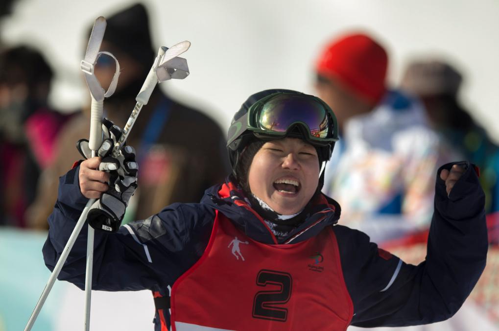 宁琴在第十三届全国冬季运动会自由式滑雪雪上技巧女子个人项目决赛获胜后庆祝。新华社记者费茂华摄