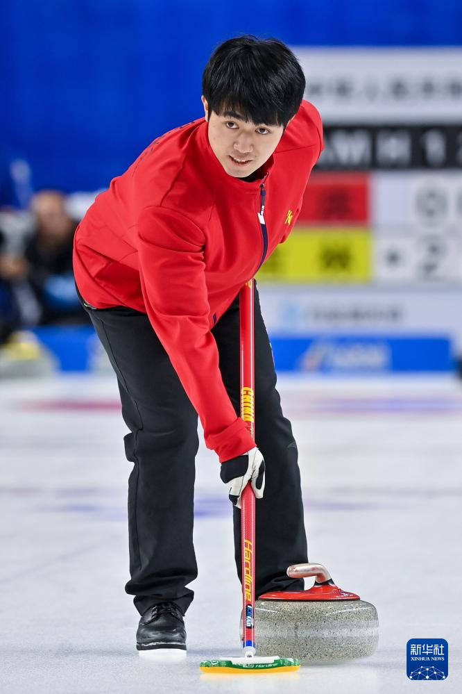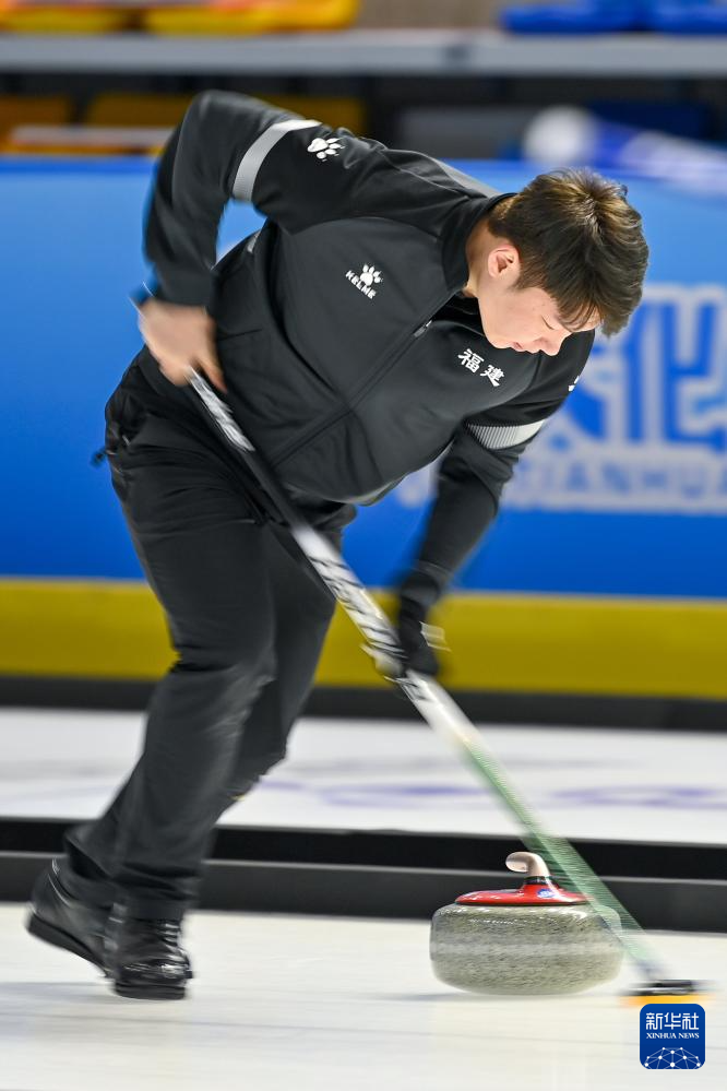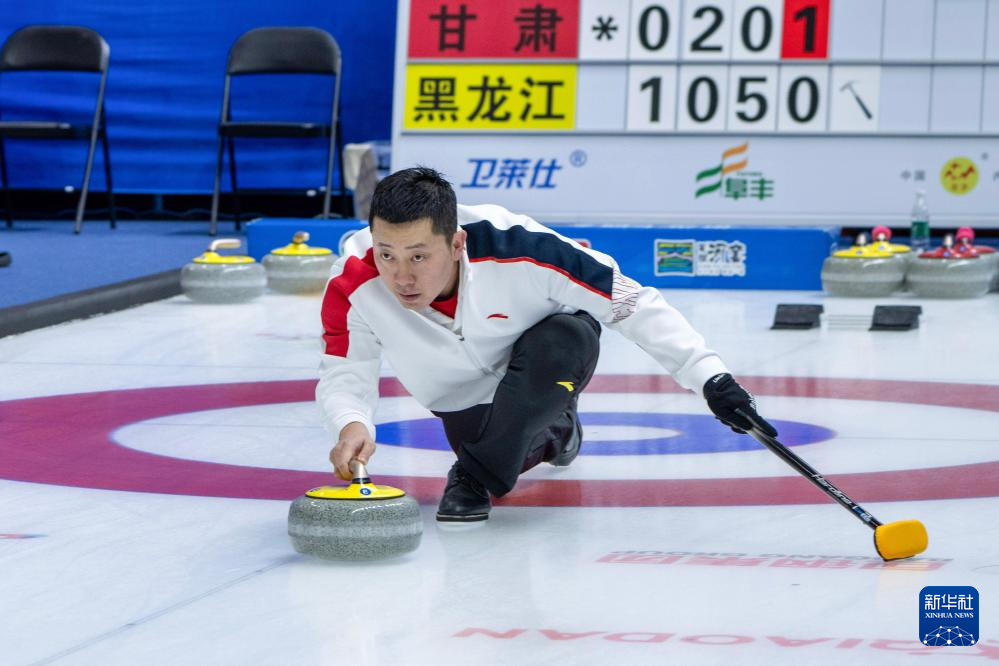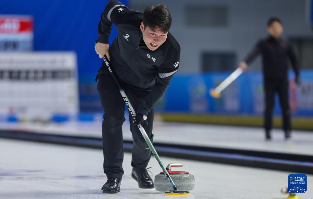 2月17日,黑龙江队选手巴德鑫在比赛中。最终,黑龙江队组合巴德鑫/姜懿伦8比4战胜甘肃队组合李刚胜/白宇。新华社记者 陈欣波 摄