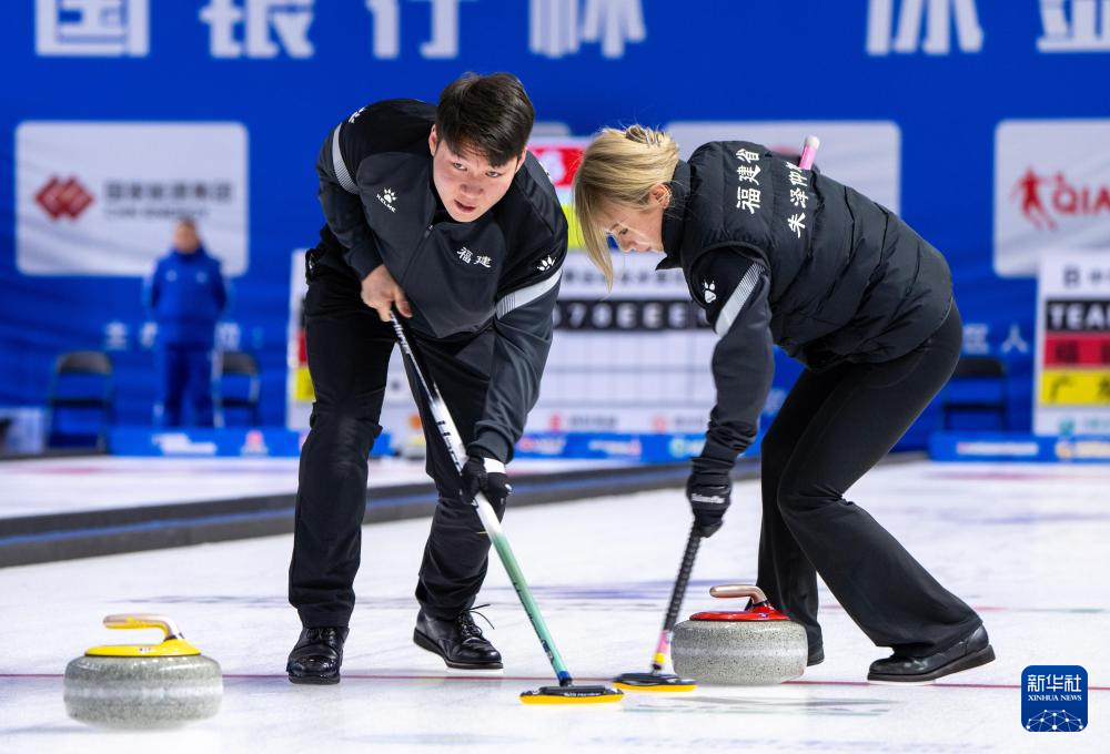 2月17日,黑龙江队组合巴德鑫/姜懿伦(右)在比赛中。最终,黑龙江队组合巴德鑫/姜懿伦8比4战胜甘肃队组合李刚胜/白宇。新华社记者 姜帆 摄