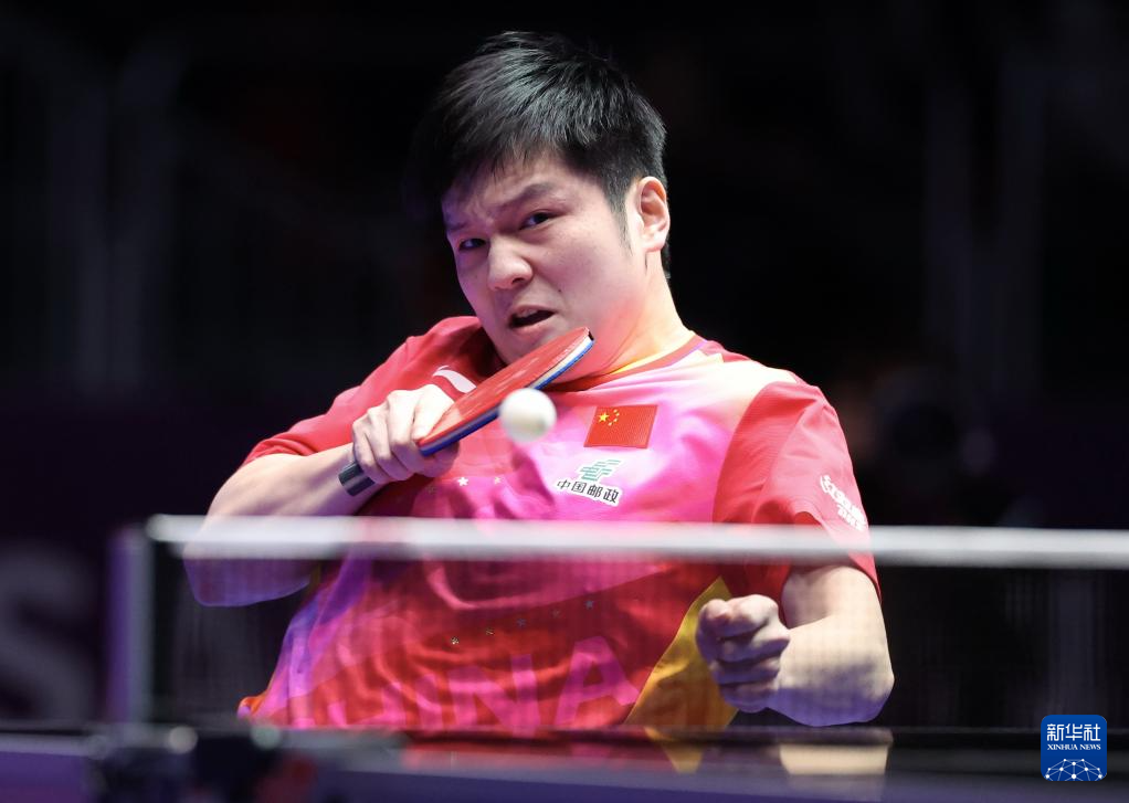 2月16日,樊振东在第一盘比赛中回球。最终,他3比0战胜比利时队选手塞德里克·努伊提克。新华社记者 杨世尧 摄