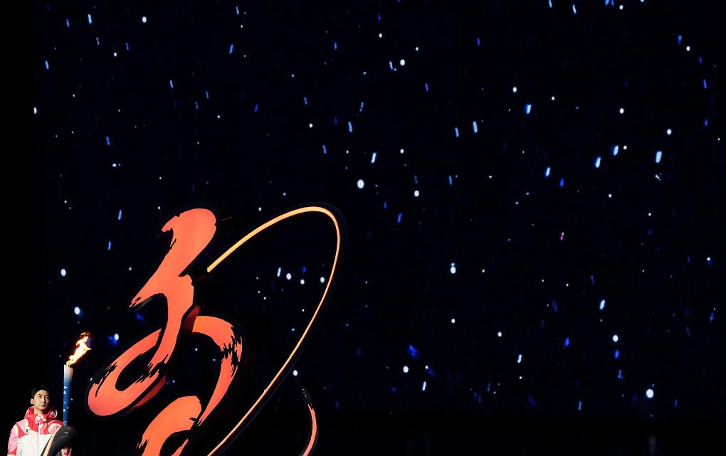 在现场观众的欢呼声中,经过第二棒火炬手、单板滑雪运动员彭程和第三棒火炬手、自由式滑雪运动员刘奕杉的传递,第四棒火炬手、冬奥会冠军武大靖高举火炬,跑向舞台中央,将手中的火炬插入“十四冬”会徽“冬之韵”。只见数字“圣火”在“冬之韵”中“流淌”,最终与舞台“相融”变为一颗火红的“冰球”,被数字化的“冰球运动员”击向场馆外的主火炬塔。