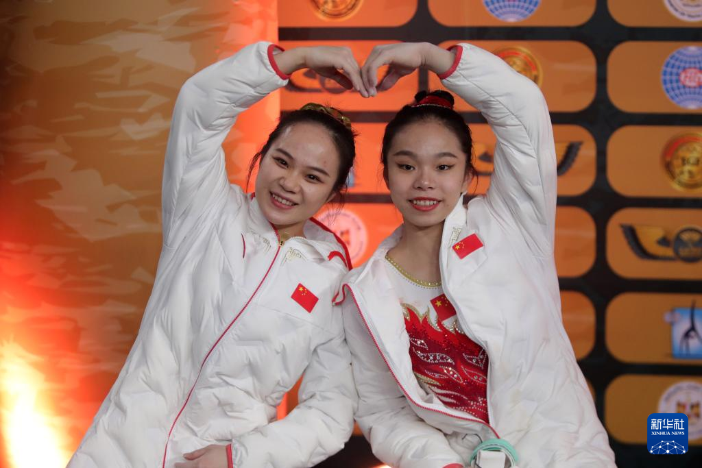 2月17日,中国选手黄卓凡(右)和罗欢在决赛后庆祝。新华社发(艾哈迈德·戈马摄)