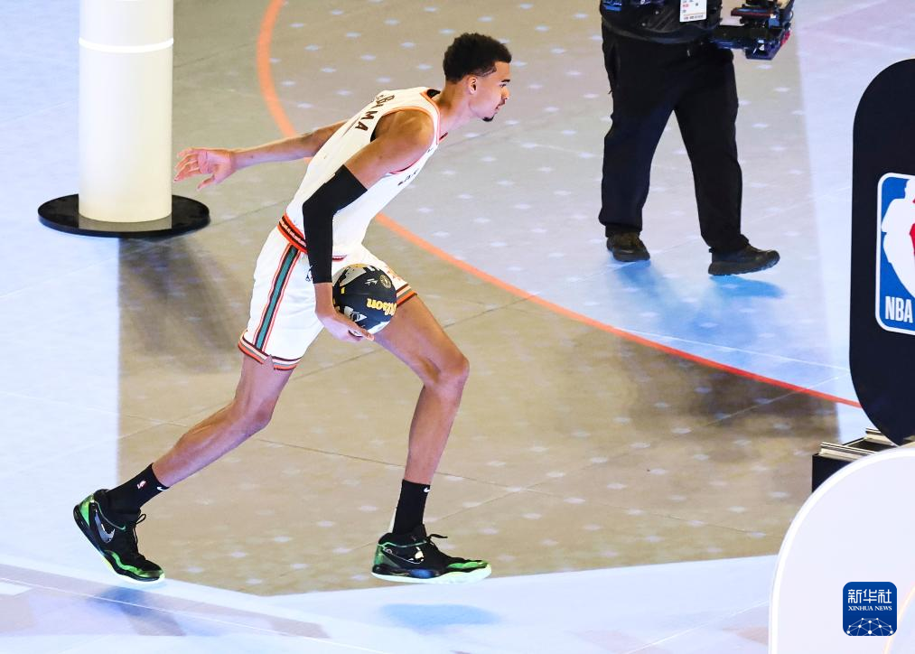 2月17日,马刺队球员文班亚马在全明星技巧挑战赛中运球。新华社发(乔尔·莱纳摄)