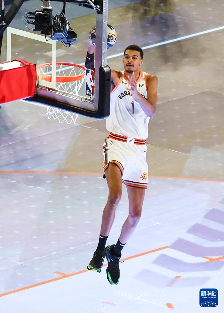 2月17日,马刺队球员文班亚马在全明星技巧挑战赛中上篮。新华社发(乔尔·莱纳摄)