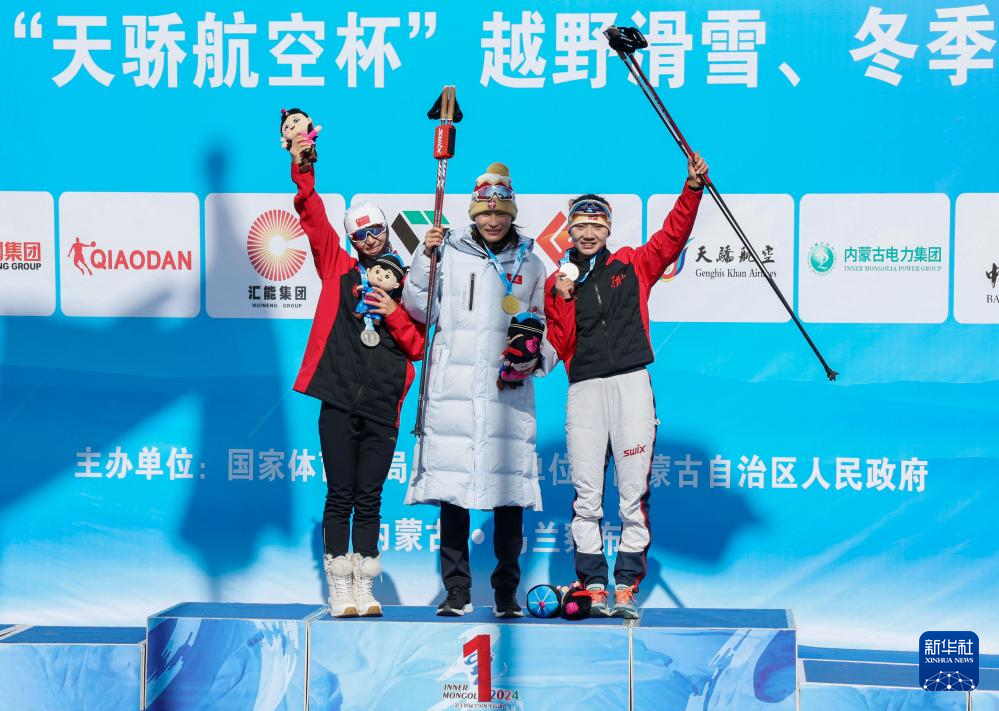 2月17日,冠军吉林队选手李磊(中)、亚军黑龙江队选手孟红莲和季军黑龙江队选手池春雪在颁奖仪式上合影。新华社记者 张晨霖 摄