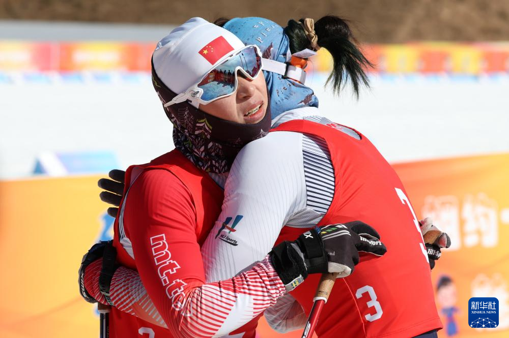 2月17日,黑龙江队选手孟红莲(左)与队友池春雪在比赛后拥抱。孟红莲以3分43秒11的成绩获得亚军,池春雪以3分45秒83的成绩获得季军。新华社记者 张晨霖 摄