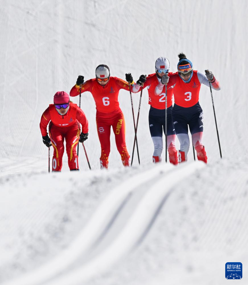 2月17日,吉林队选手李磊(左二)在比赛中,她以3分42秒26的成绩获得冠军。新华社记者 刘磊 摄