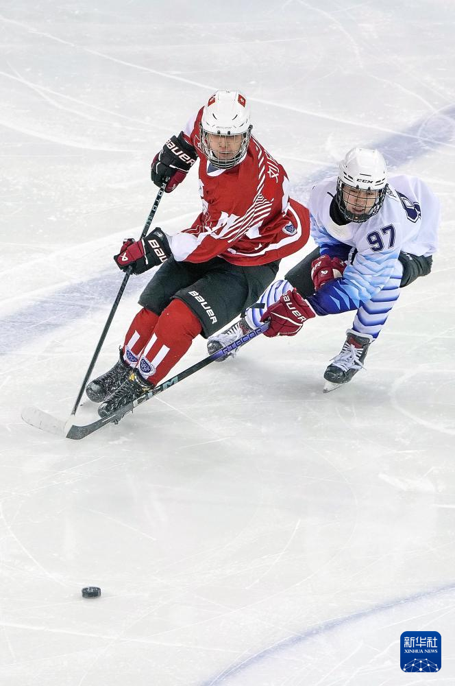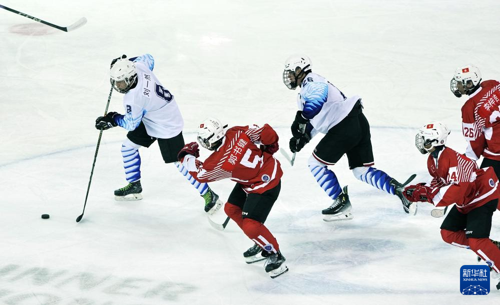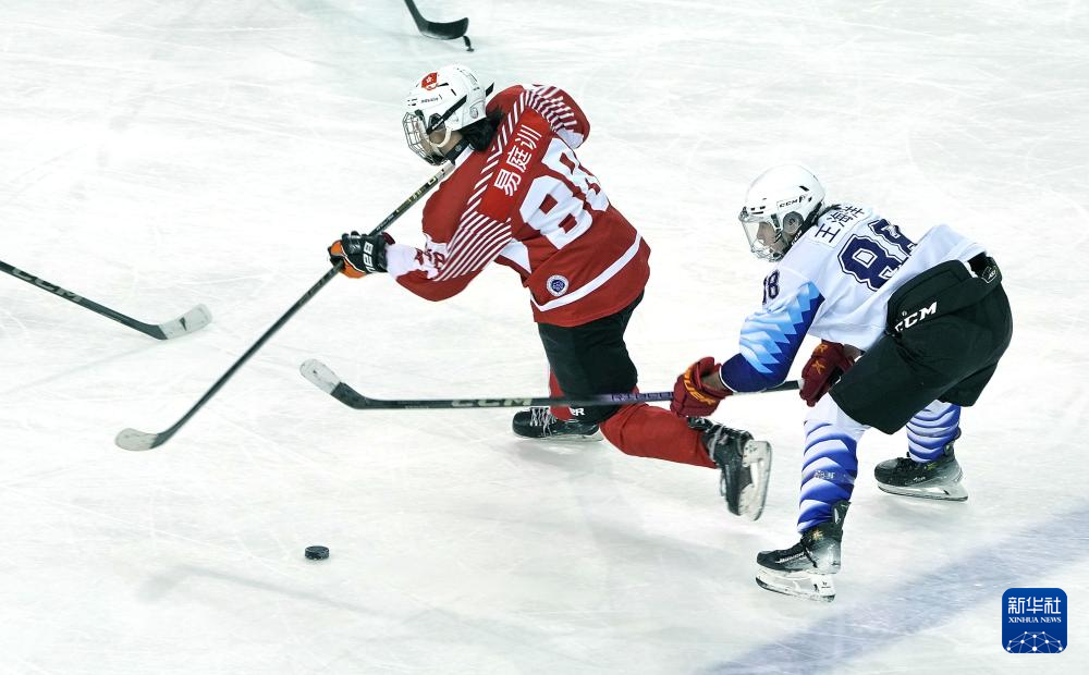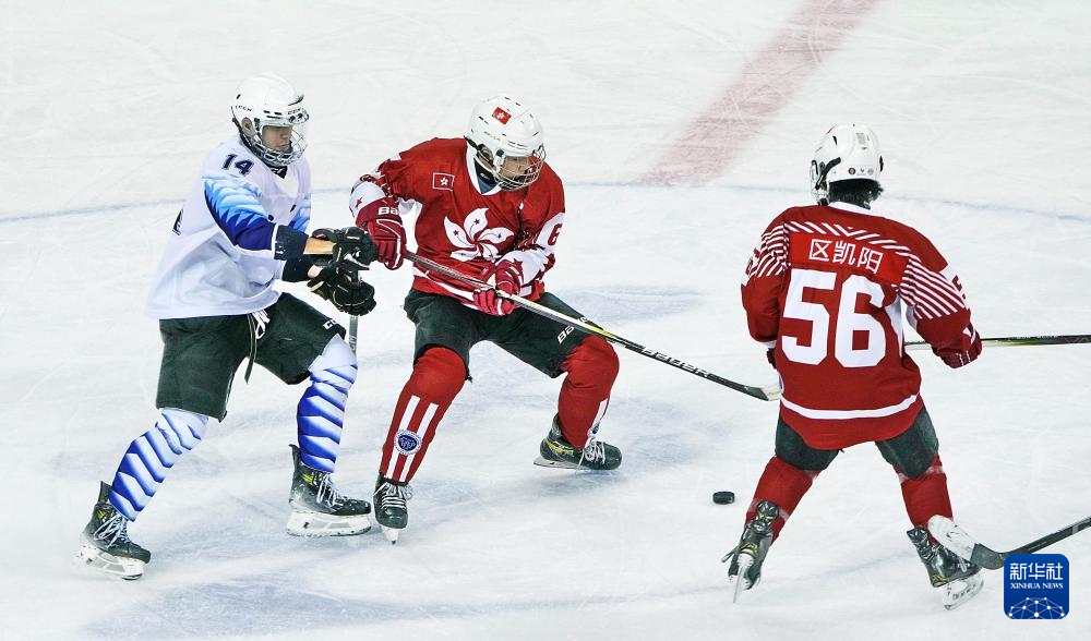 当日,在内蒙古冰上运动训练中心冰球馆举行的第十四届全国冬季运动会青年组男子冰球比赛中,香港队4比1战胜天津队。