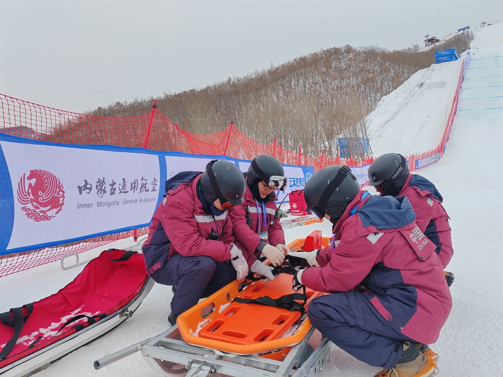 为了确保受伤人员能够第一时间得到救治,医疗保障团队反复演练流程,通过训练缩短救治衔接时间。15日进行的单板滑雪U型场地技巧比赛中,有运动员受伤较重,当时无法站立。“U型场地有运动员受伤,请山下做好救治准备。”从接收到对讲机的指令,到滑雪医生进场查看,对伤员进行固定,再到救援队搬运担架,由雪地摩托把伤员运往赛场医疗站,总共用时9分钟。