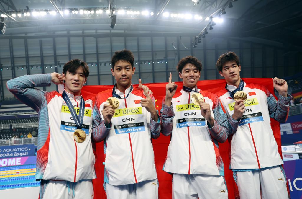 2月11日,中国队选手王浩宇、张展硕、季新杰和潘展乐(从左到右)在男子4X100米自由泳接力夺冠后留影。新华社记者 雒圆 摄
