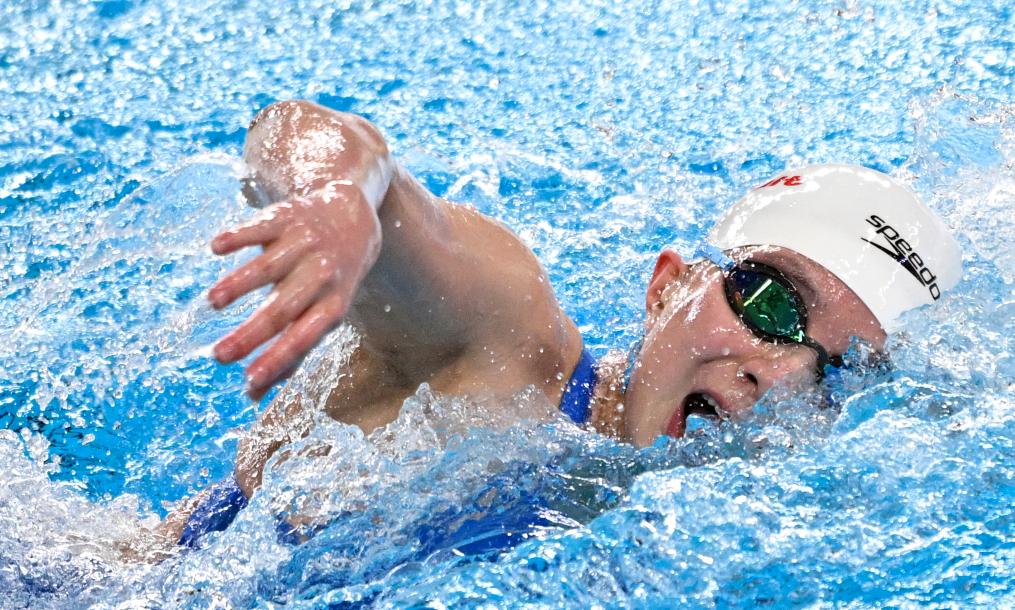 2月15日,中国队第二棒龚真琦在女子4X200米自由泳接力决赛中。新华社记者 夏一方 摄