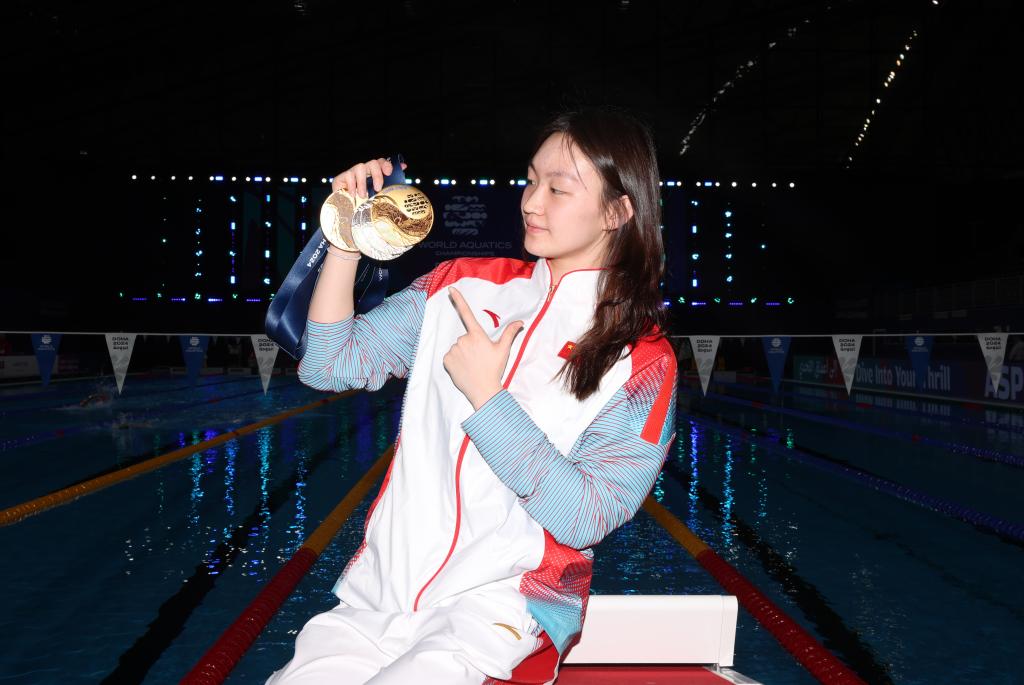 2月18日,中国游泳队成员李冰洁展示奖牌。新华社记者 雒圆 摄