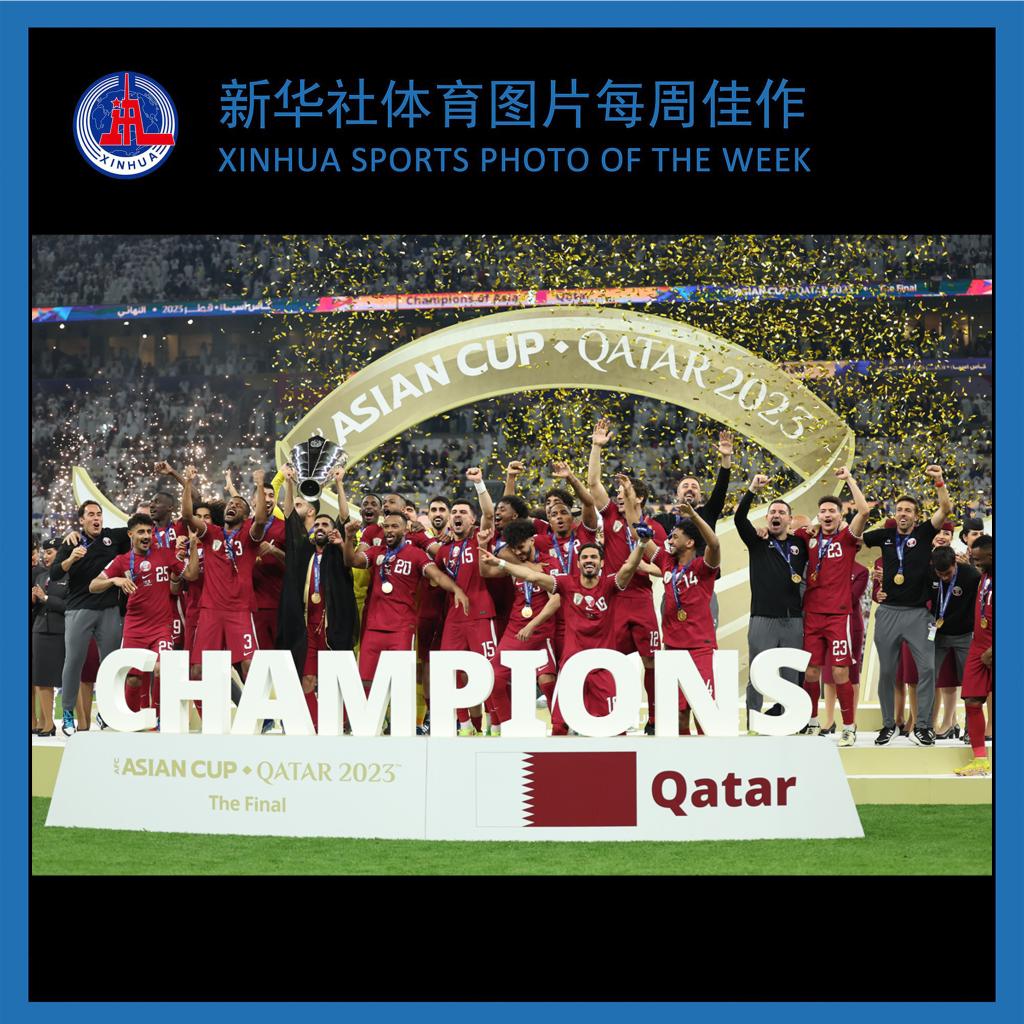 2月10日,卡塔尔队在颁奖仪式上庆祝。新华社记者 贾浩成 摄