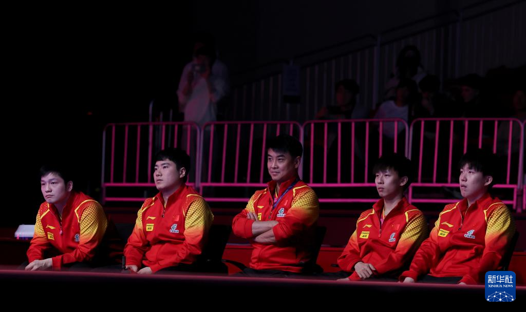 2月19日,中国男队主教练王皓(中)和队员樊振东(左一)、梁靖崑(左二)、林高远(右二)、王楚钦在场边观赛。新华社记者 姚琪琳 摄