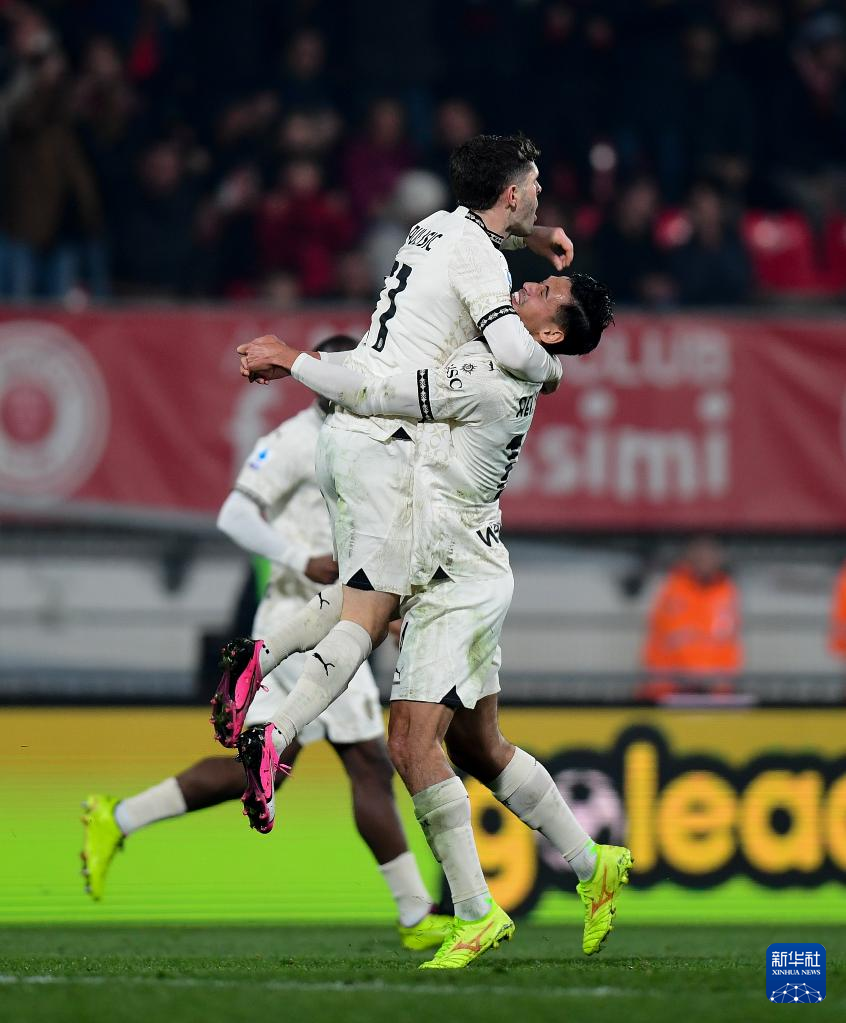 2月18日,AC米兰队球员普利希奇(左)射门得分后与队友庆祝。新华社发(奥古斯托·卡萨索利摄)