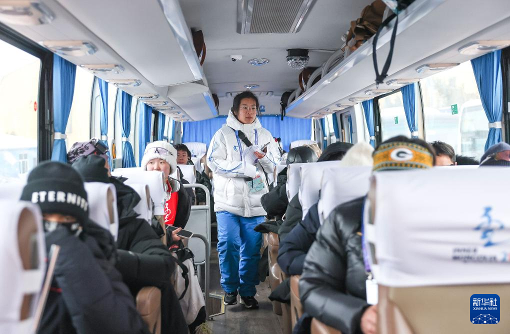 2月18日,在扎兰屯赛区,志愿者在比赛结束后上车清点返回酒店的人员人数。新华社记者 王楷焱 摄