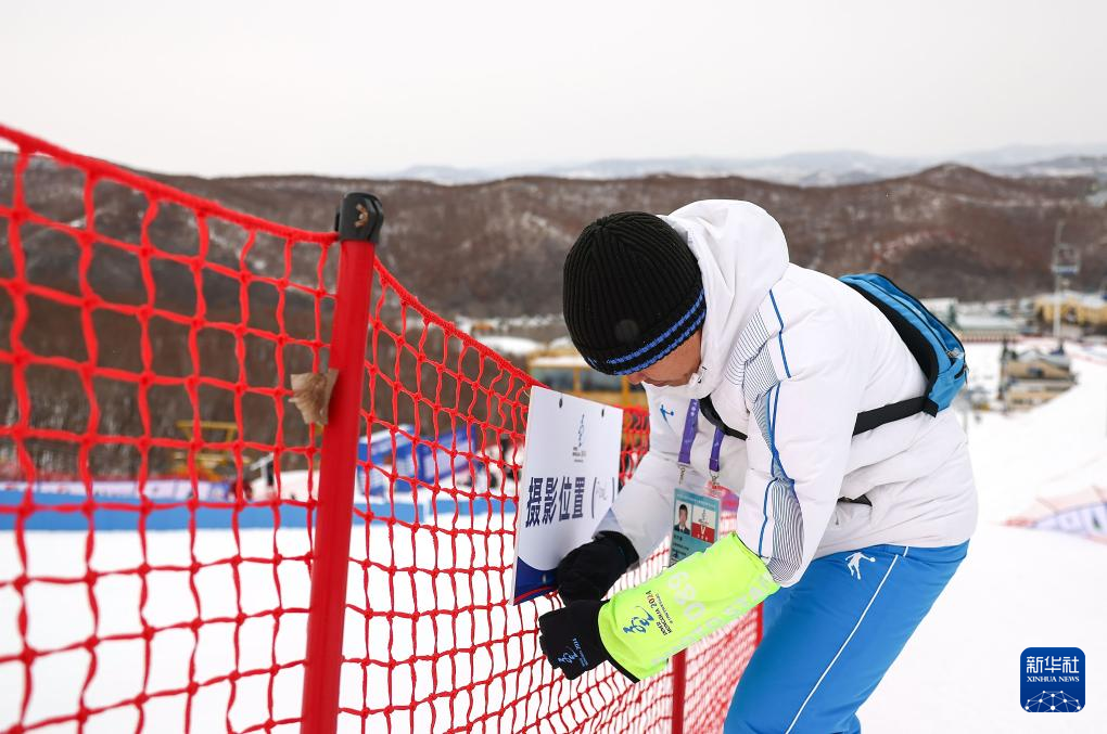 2月18日,在扎兰屯赛区,志愿者在自由式滑雪雪上技巧比赛场地固定摄影位置标牌。新华社记者 王楷焱 摄