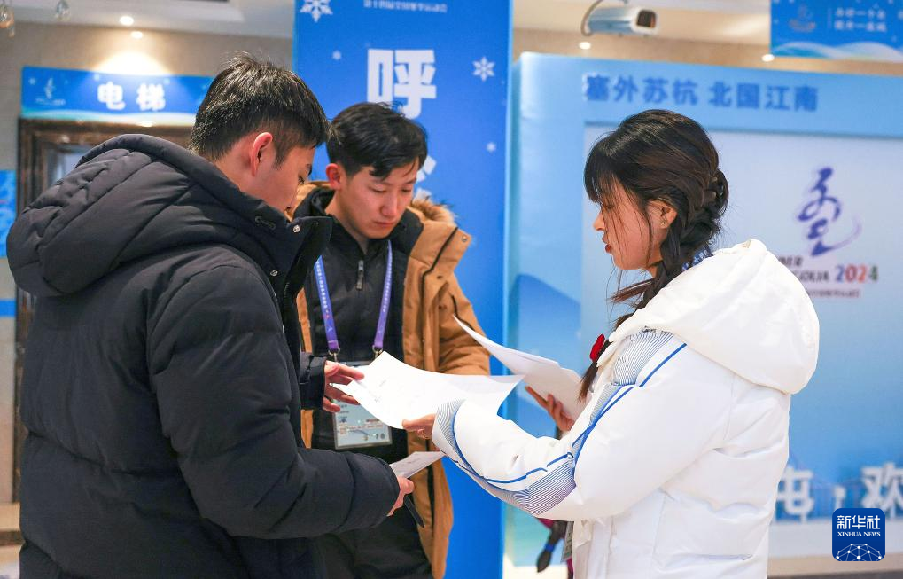 2月18日,来自呼伦贝尔职业技术学院的志愿者阿娜尔(右一)向媒体记者提供赛程表。新华社记者 连振 摄