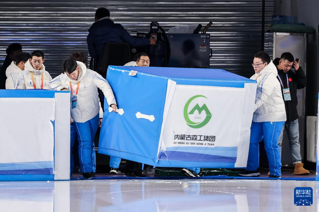 2月18日,在内蒙古冰上运动训练中心短道速滑馆,志愿者们在赛前搬运赛场边的防撞垫。新华社记者 李博 摄