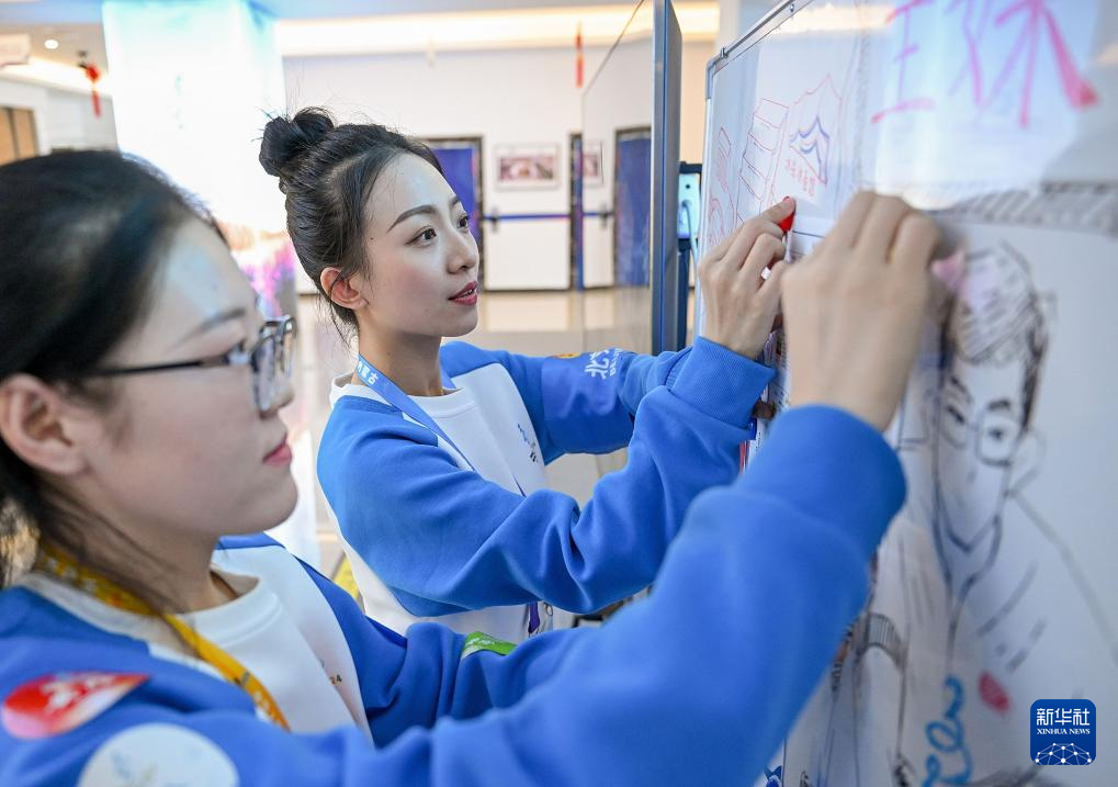 2月19日,来自中国传媒大学的志愿者王琳(右)和同伴在主媒体中心张贴班车时刻表。她是由北京团市委选派支援“十四冬”的30名北京冬奥会志愿者之一。新华社记者 连振 摄