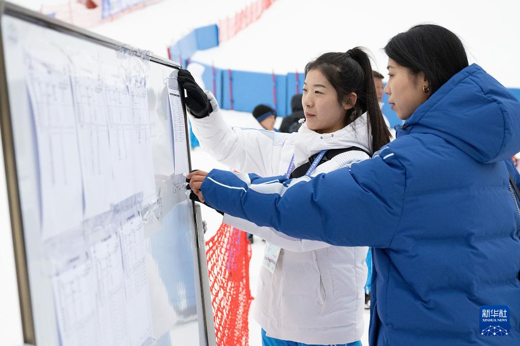 2月19日,在凉城赛区,一位志愿者(左)与裁判员交流赛场情况。新华社记者 李志鹏 摄