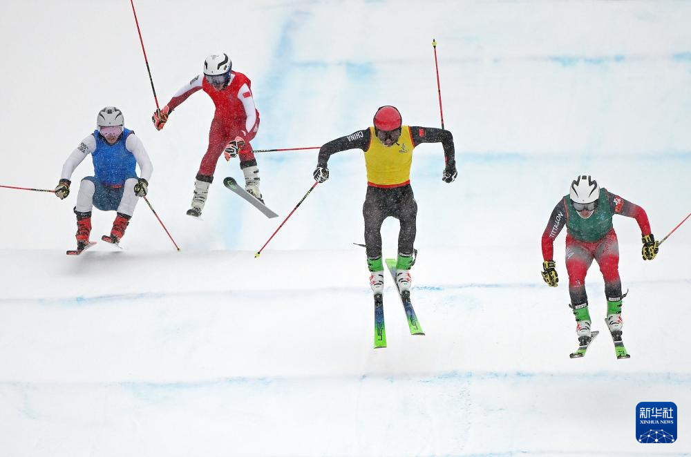 2月20日,吉林队选手哈斯提尔·阿德力江(右一)和队友波拉夏克·波拉提(右二)、广西队选手邱习杨(左一)、河北队选手肖飞在比赛中。新华社记者 赵子硕 摄