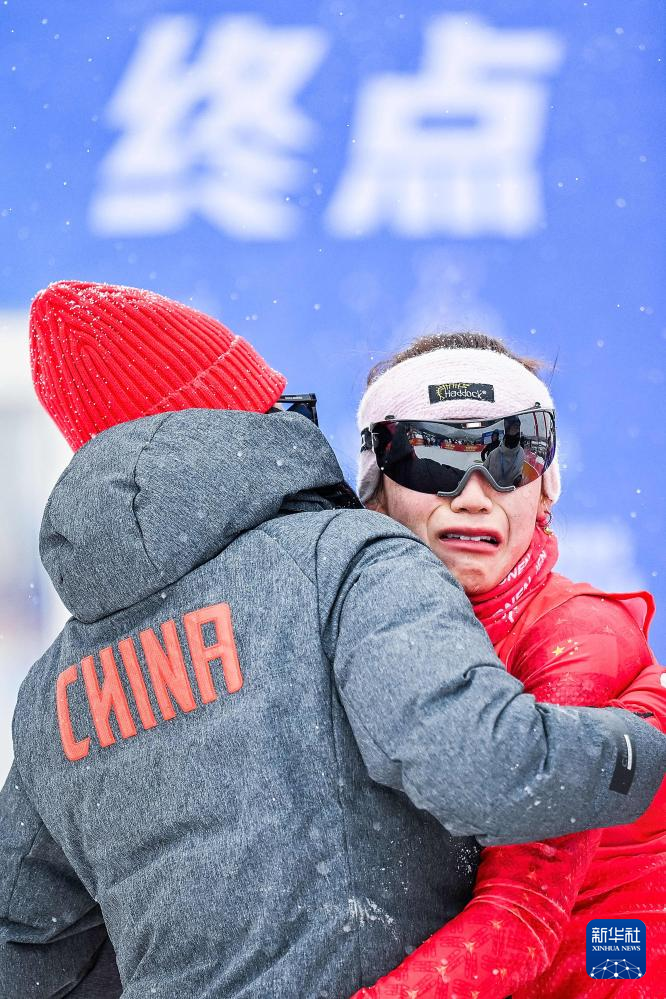 2月20日,辽宁队教练在终点处拥抱安慰辽宁队选手丁雨欢(右)。新华社记者 伍志尊 摄
