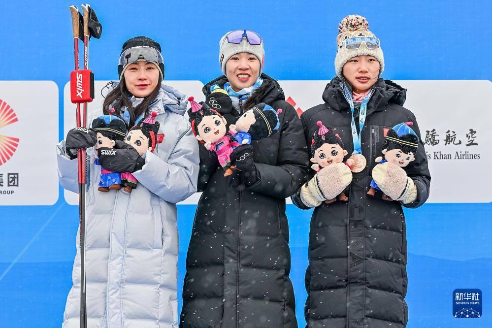 2月20日,冠军河北队选手褚源蒙(中)、亚军吉林队选手孟繁棋(左)和季军辽宁队选手杨连红在颁奖仪式上。新华社记者 伍志尊 摄