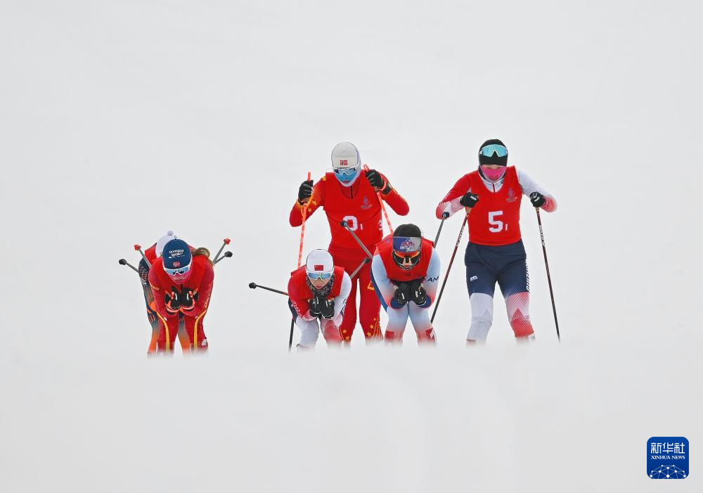 2月21日,黑龙江队孟红莲(右)和队友陈玲双在比赛中进行接力。新华社记者 赵子硕 摄