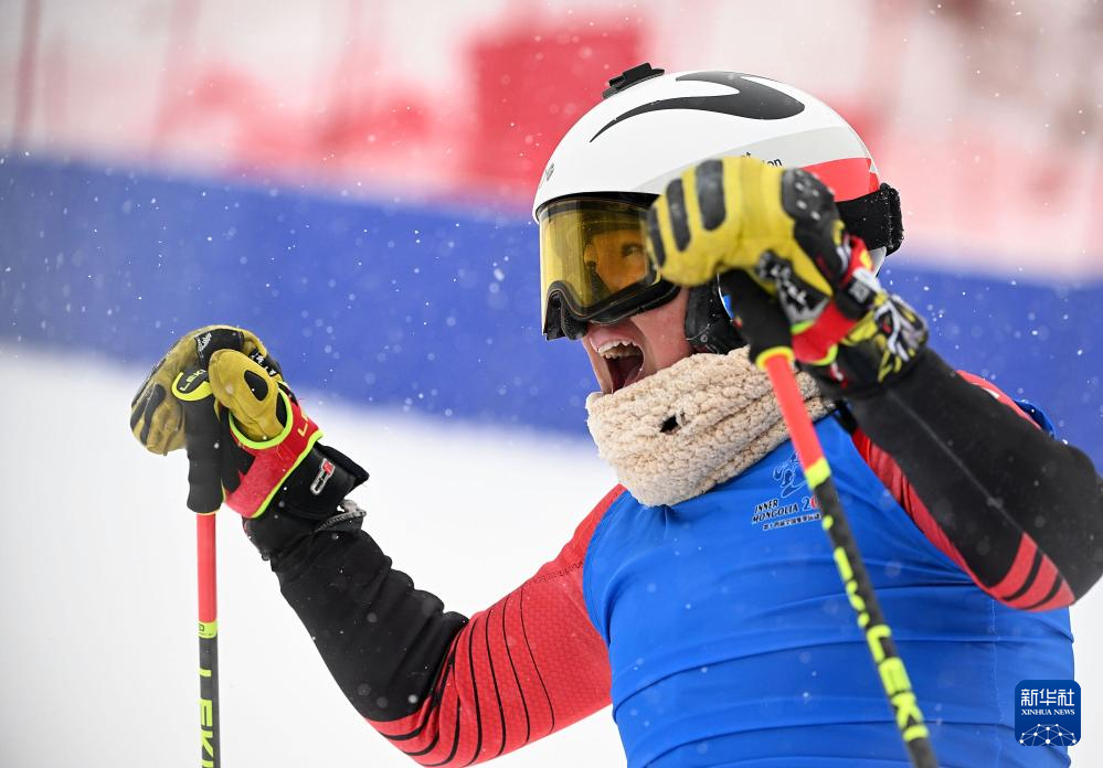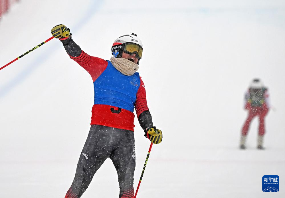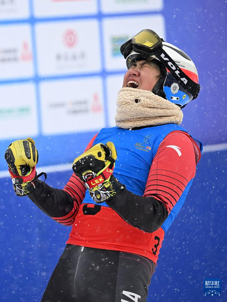2月20日,辽宁队选手赵伟博在冲过终点后庆祝。新华社记者 赵子硕 摄