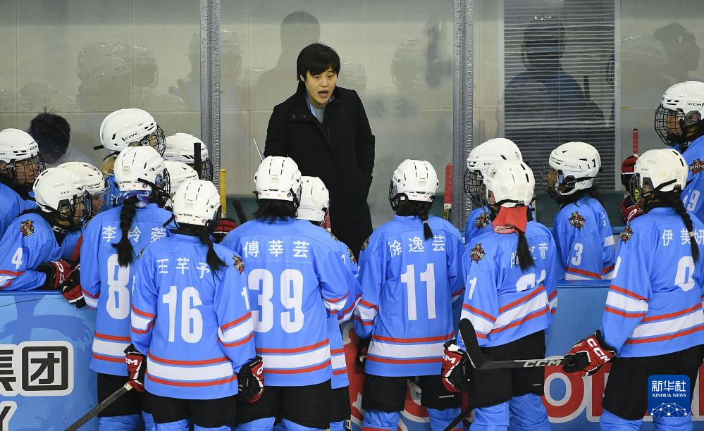 2月21日,广东队主教练齐雪婷(上)在比赛间隙布置战术。新华社记者 邓华 摄
