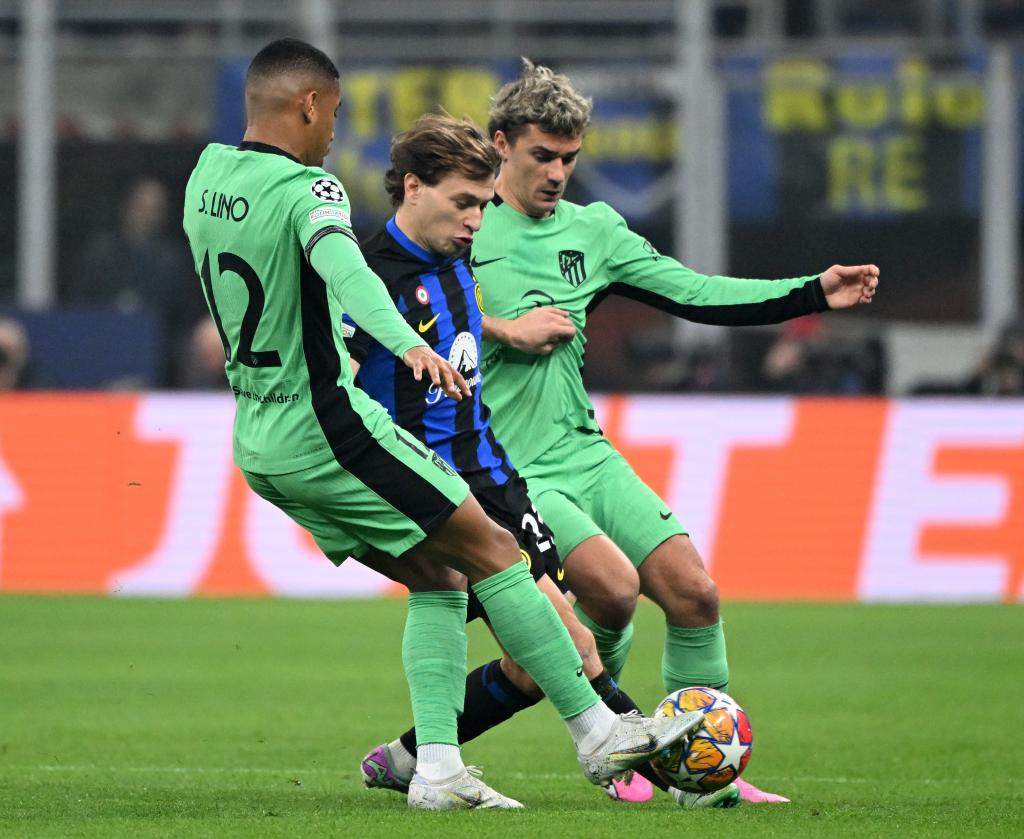 2月20日,国际米兰队球员巴雷拉(中)与马德里竞技队球员格列兹曼(右)、利诺在比赛中拼抢。 新华社发(阿尔贝托·林格利亚摄)