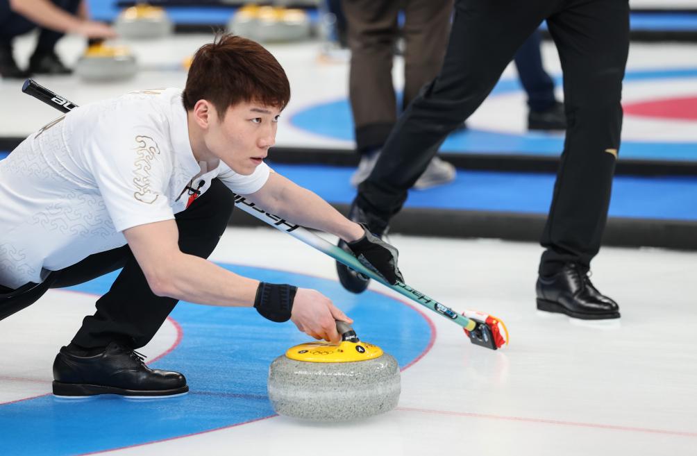 2022年2月12日,王智宇在北京2022年冬奥会男子冰壶循环赛中国队对阵意大利队的比赛中掷壶。新华社记者 杨磊 摄