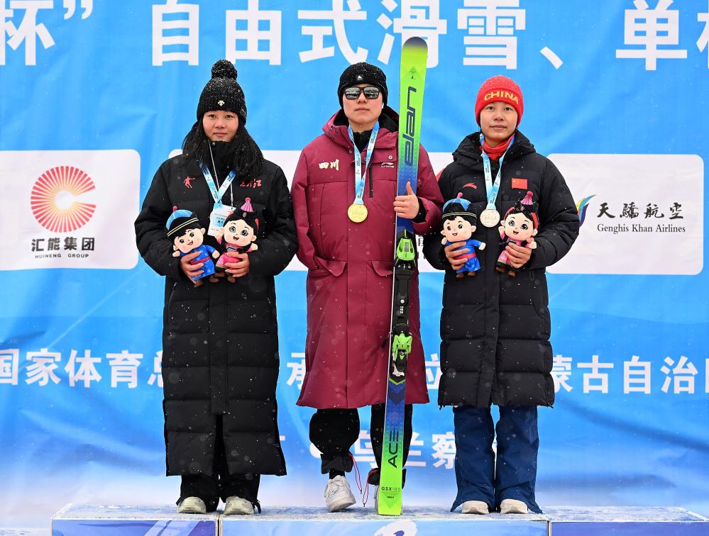 2月20日,冠军四川队选手潘禹辰(中)、亚军黑龙江队选手张雪莲(左)、季军云南队选手普蕊(右)在颁奖仪式上。新华社记者 赵子硕 摄