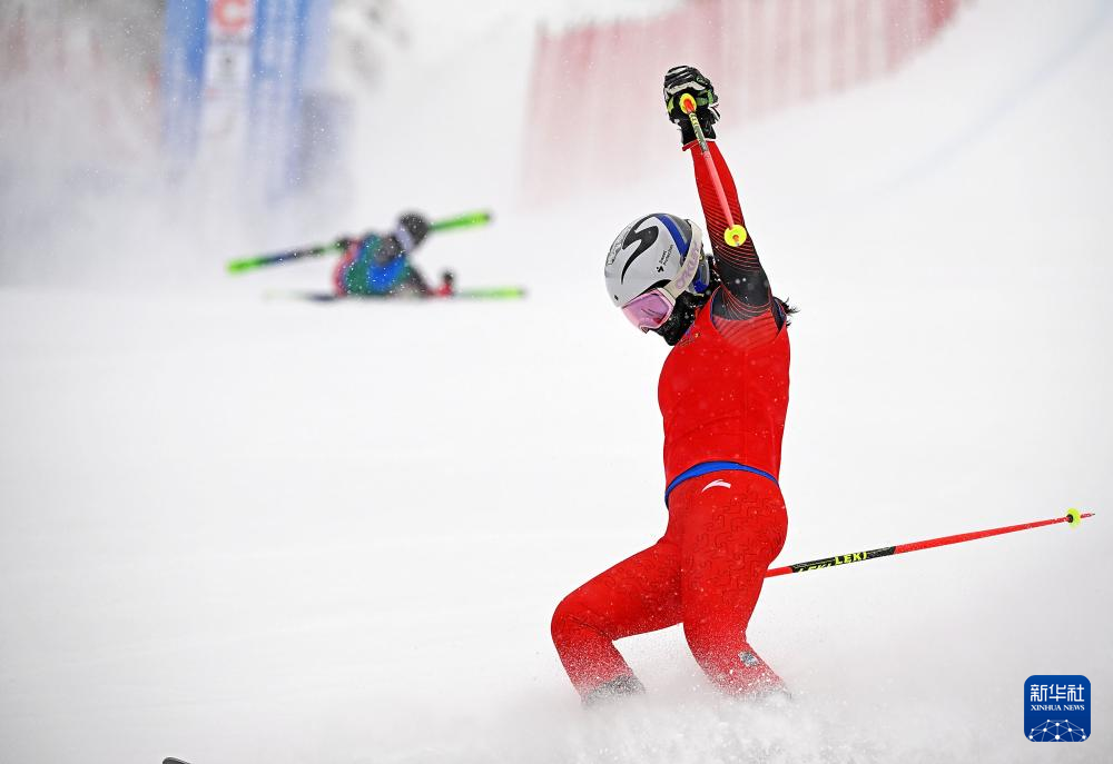 2月20日,黑龙江队选手张雪莲在冲过终点后庆祝。新华社记者 赵子硕 摄