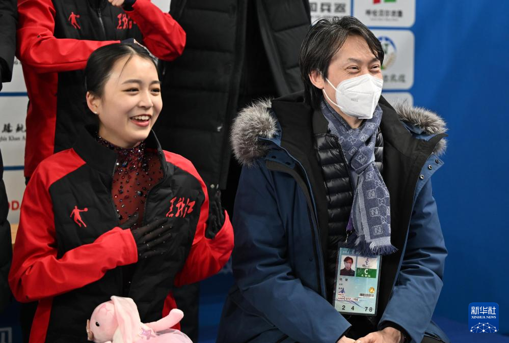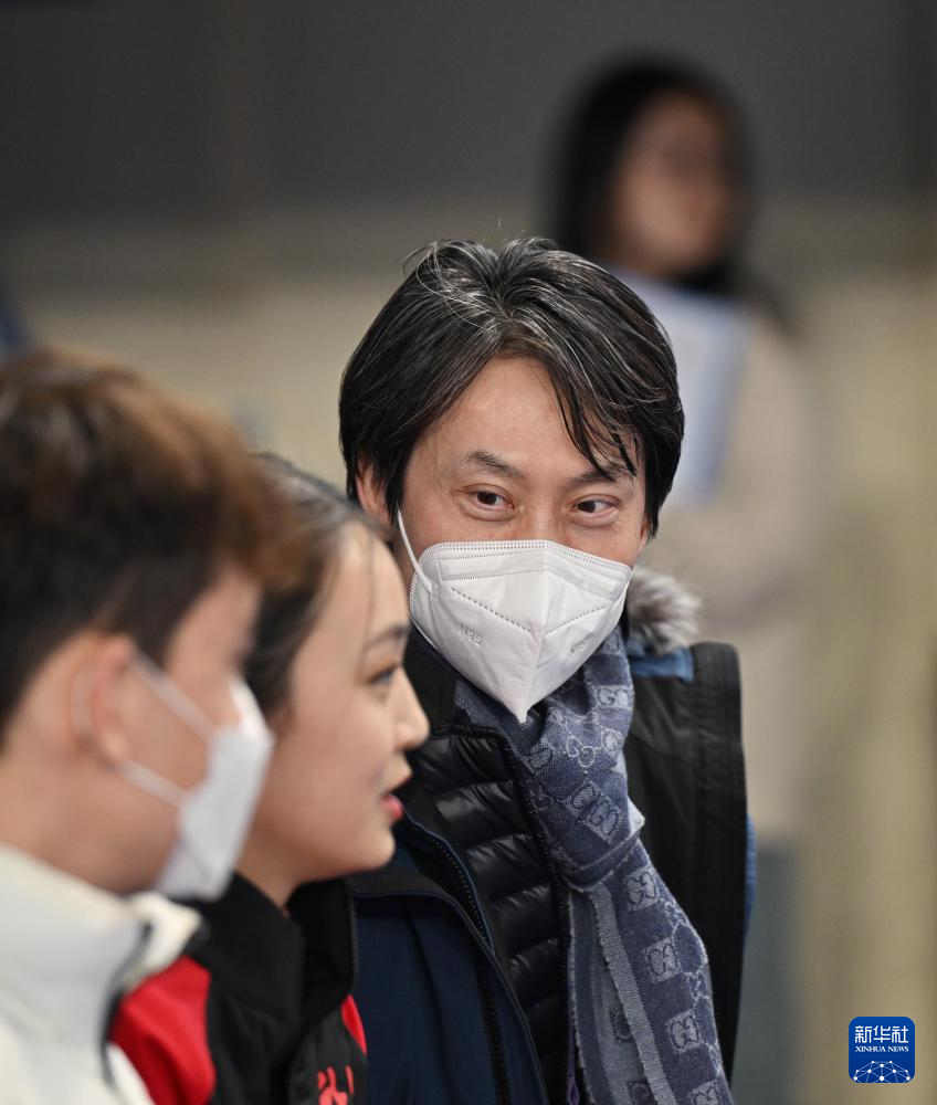 2月21日,黑龙江队教练佟健(右)与选手朱易在比赛后等待成绩。朱易以51.44分的成绩位列该项目第七。新华社记者 侯昭康 摄