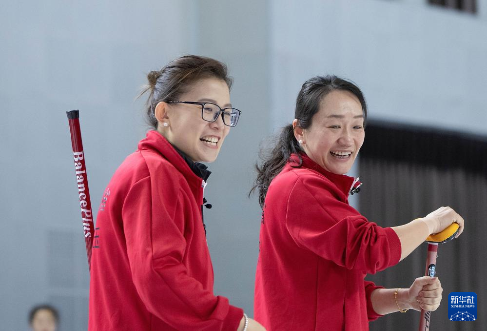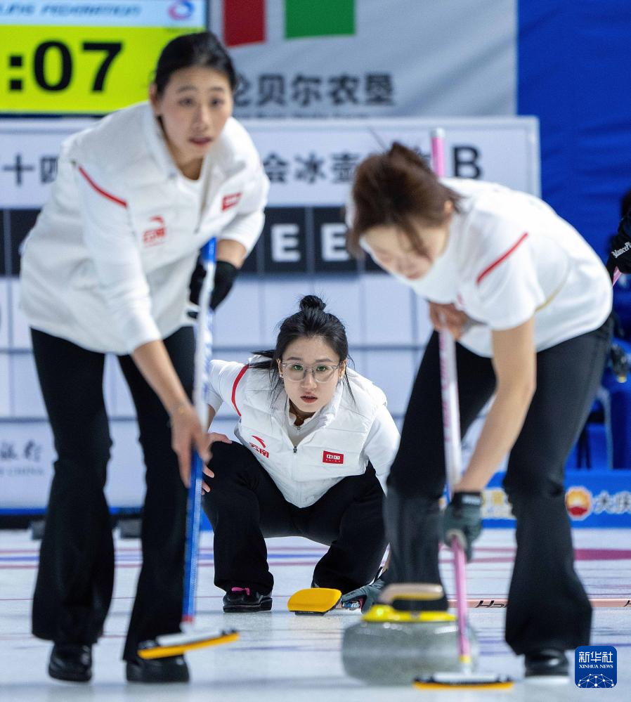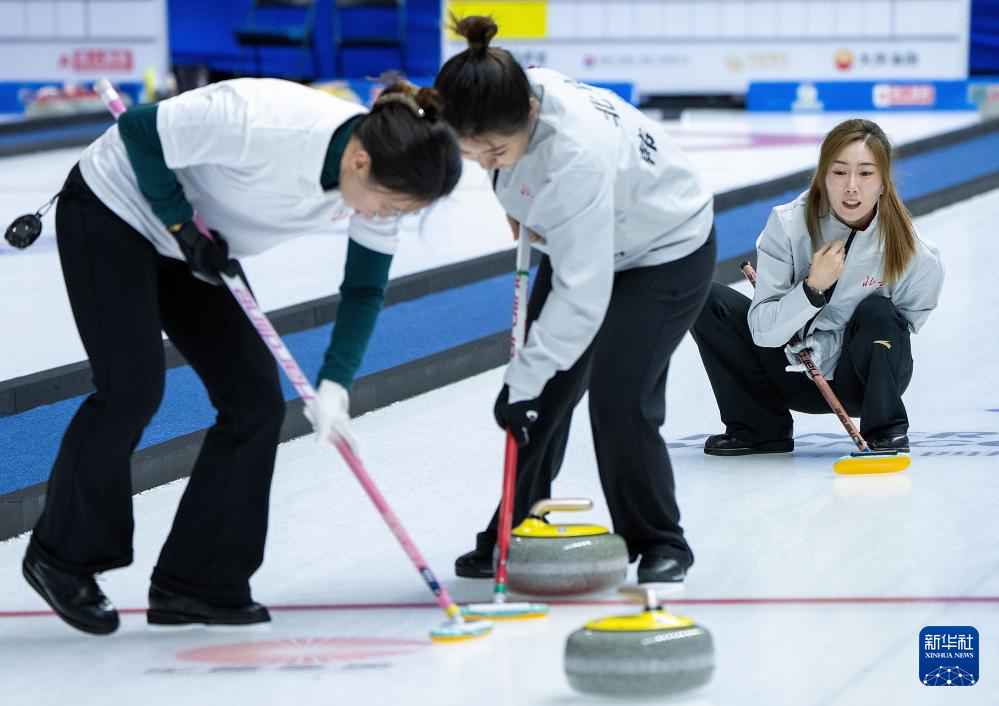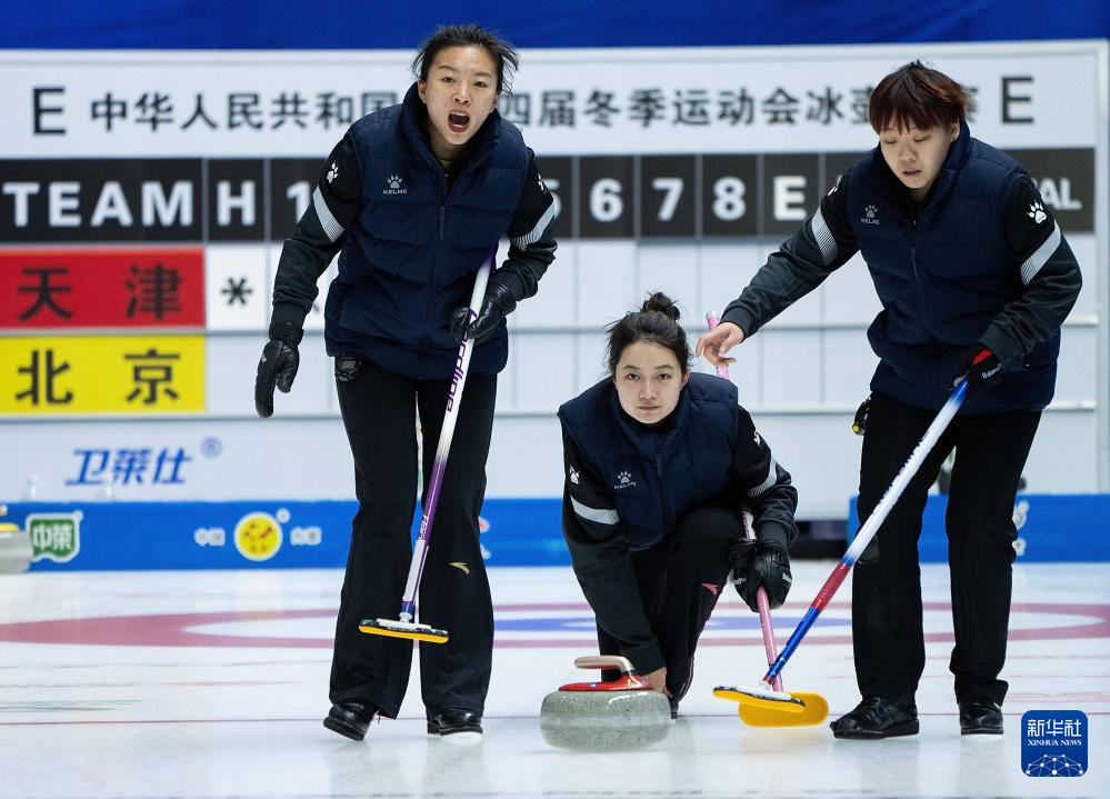 2月22日,天津队选手苏亭毓(左)、佘秋彤(中)、姜春梅在比赛中。最终,北京队11比5战胜天津队。新华社记者 陈欣波 摄